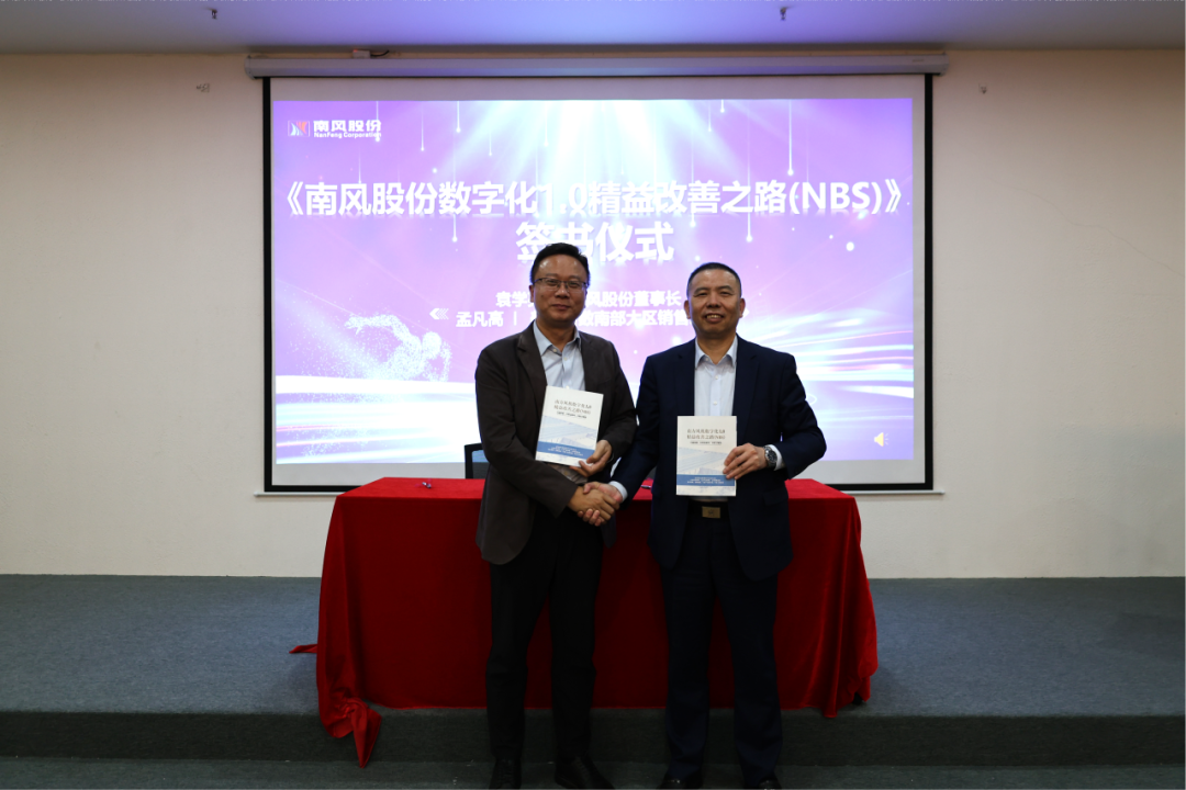 大会期间,举行了《南风股份(300004)数字化1.0精益改善之路(NBS)》特别签书仪式。在董事长袁学亮与美云智数南部大区销售总监孟凡高共同见证下,该书正式发布。该书系统总结了项目建设的核心方法论、典型案例与管理智慧,不仅是对数字化1.0阶段工作的高度凝练,更为后续数智化升级提供了可复制、可推广的实践指南。